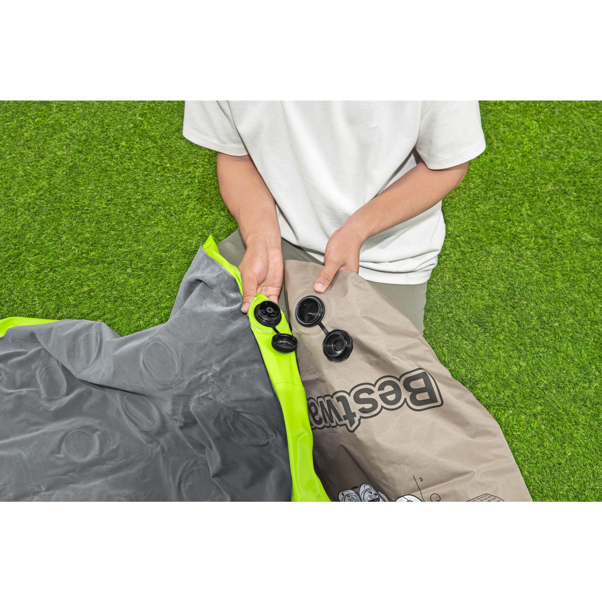 The Bestway Roll & Relax Air Mattress is perfect for an outdoor excursion. With this innovative bed, there is no need to carry an additional pump or or get exhausted trying to blow the bed up manually. The included AirCinch™ Bag Pump inflates the bed easily with about 5-7 hand compressions, while doubling as the carry bag. AirCinch Inflation System: Once you are ready to inflate the bed, simply remove it from the carry bag and connect the bag to the large 2-way quick release valve. Open the bag and swing it up and down to catch plenty of air. Gather up the open end of the bag to trap the air inside. Squeeze the bag to force the air out and into the bed, and repeat until your desired firmness is reached. When you are ready to deflate the mattress, it can easily fit back into the AirCinch carry bag for transport and storage. Durable Construction: This air mattress provides essential comfort for a great night's sleep. The velvet-like sleep surface is soft and warm. The inner coil beams mimic the feel of a standard mattress, which is great for active sleepers. These coils provide contoured support around you and can respond quickly to body movement. Convenient, compact and comfortable, the Bestway Roll & Relax Air Mattress is uniquely designed for the outdoors, so you can feel secure knowing your bed can withstand almost any terrain you wish to explore.