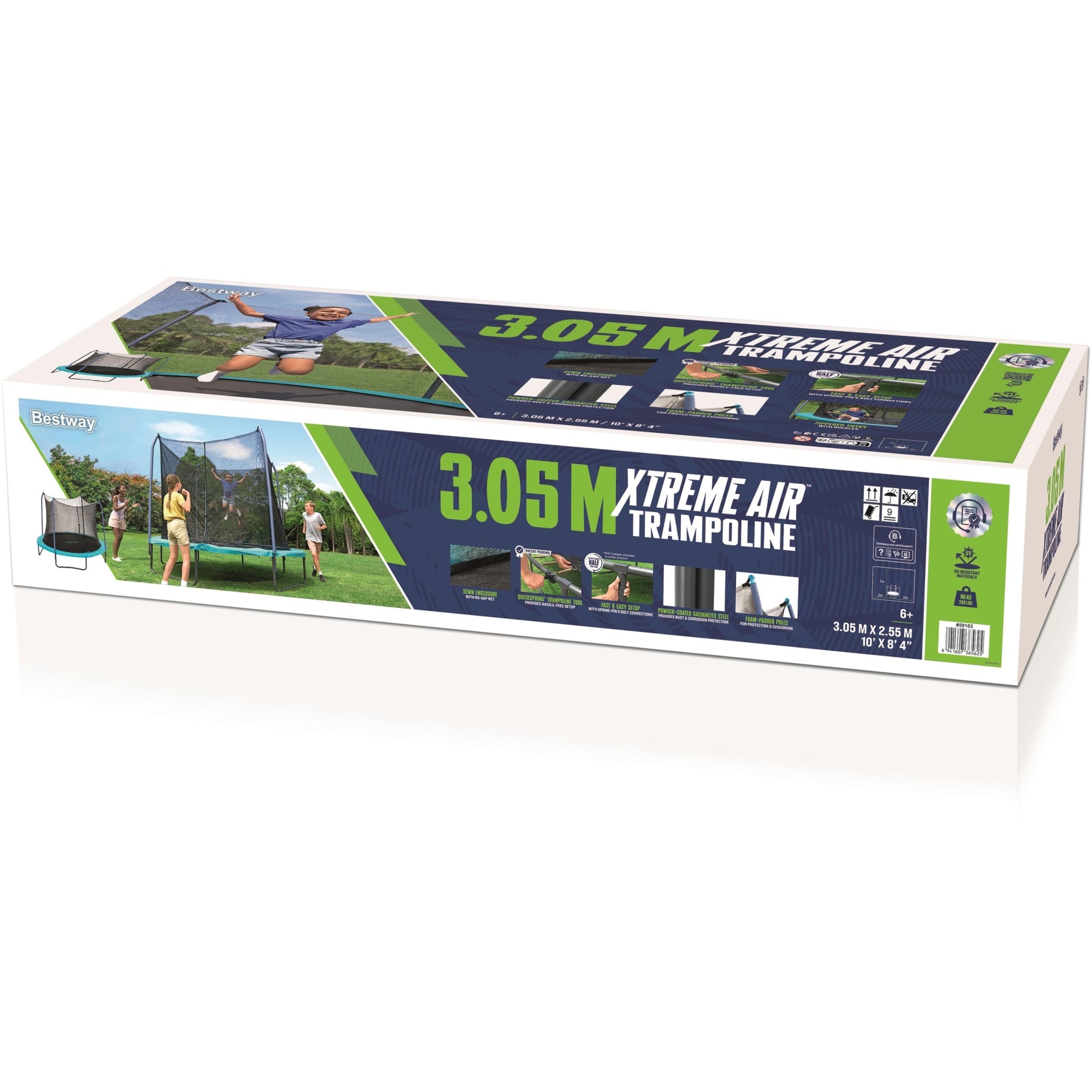 Bounce into Backyard Fun with the Bestway Xtreme Air 3.05 m Trampoline! Treat your kids to hours of excitement and active play right at home with the durable and long-lasting Bestway Xtreme Air 3.05 m Trampoline. Designed for children aged 6 and up, this spacious trampoline is built with safety in mind—featuring a no-gap, sewn enclosure net, an L-shaped zippered entry with secure buckles, and foam-padded enclosure poles for added protection. All-in-One Setup Everything you need is included in the box for a complete setup. With Bestway’s patent-pending QuickSpring tool, spring installation is quick and easy using the dual-action wrench handle. The spring-pin and bolt connections on the enclosure poles make assembly straightforward and efficient. Durability You Can Count On Built with powder-coated galvanized steel, the trampoline frame resists rust and corrosion, ensuring long-lasting performance in outdoor environments. Weather-resistant materials on the netting, spring pad, and jumping mat allow you and your family to enjoy years of backyard fun, rain or shine.
