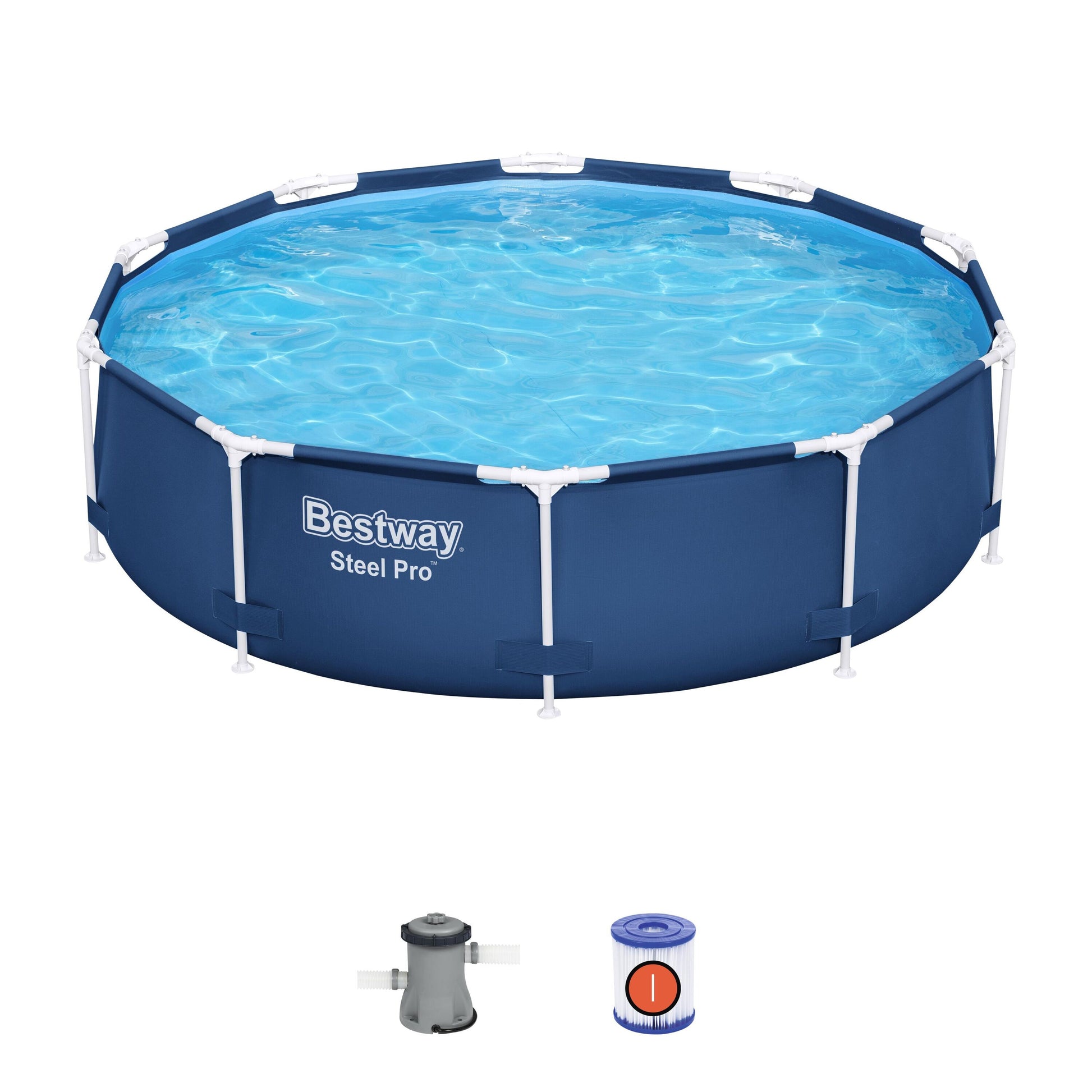 It doesn’t get any better than having your very own pool in your backyard! The Bestway® Steel Pro™ Above Ground Pool offers a durable option at a great price. Durable Construction: The corrosion-resistant steel frame is equipped with our FrameLink System™ for a sturdy and secure frame connection. The protective connectors prevent damage from rust-causing metal-on-metal contact. The sturdy DuraPlus™ liner is made out of an ultra-durable 3-layer material that is reinforced for strength and puncture-resistance. DuraPlus is 15% more tear resistant, 33% more stretch resistant and 83% more puncture resistant than standard PVC, ensuring your pool will last summer after summer. Additional Features: This above ground pool set also comes stocked with a 1,249 L (330 gal.) filter pump to keep the pool water looking crystal clear. Plus, this pool is very simple to set up and to take down for off-season storage. No tools are required, and a hose connects to the built-in flow control valve to quickly and easily drain away pool water when you are ready to take it back down Water Capacity (90%): 4,678 L Warranty: 6 months on the liner & 12 months on the pump motor.
