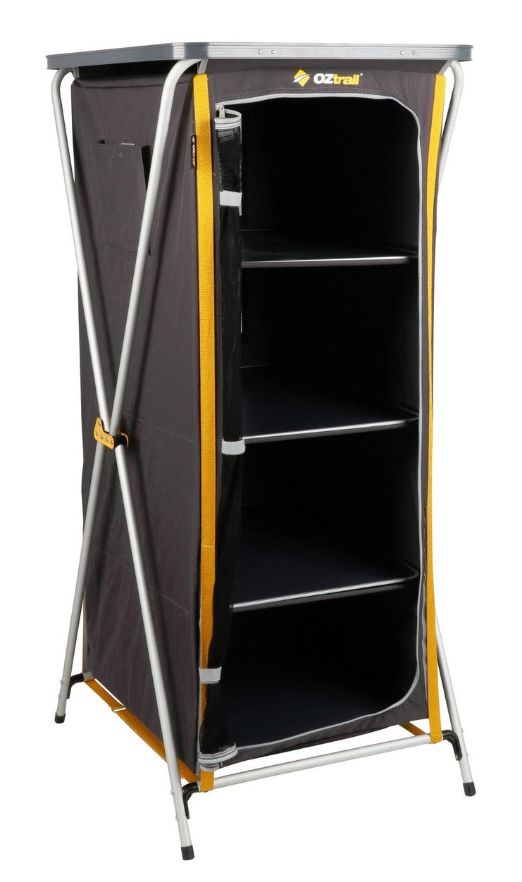 The OZtrail 4 Shelf Deluxe Camp Cupboard is the perfect addition to any campsite, use it as a pantry in the kitchen area or a storage cupboard in the tent! Plus take advantage of the hard top for extra work space or more storage. The cupboard provides portable, compact storage that's easy to assemble too. With a sturdy aluminium frame, durable Oxford polyester fabric skin, removable MDF shelves and handy side mesh pockets for extra storage it is perfect for keys, torches & other gadgets that tend to get lost. Shelf supports are sewn-in for increased shelf weight capacity. The cupboard is lightweight and packs down flat into a bag provided.