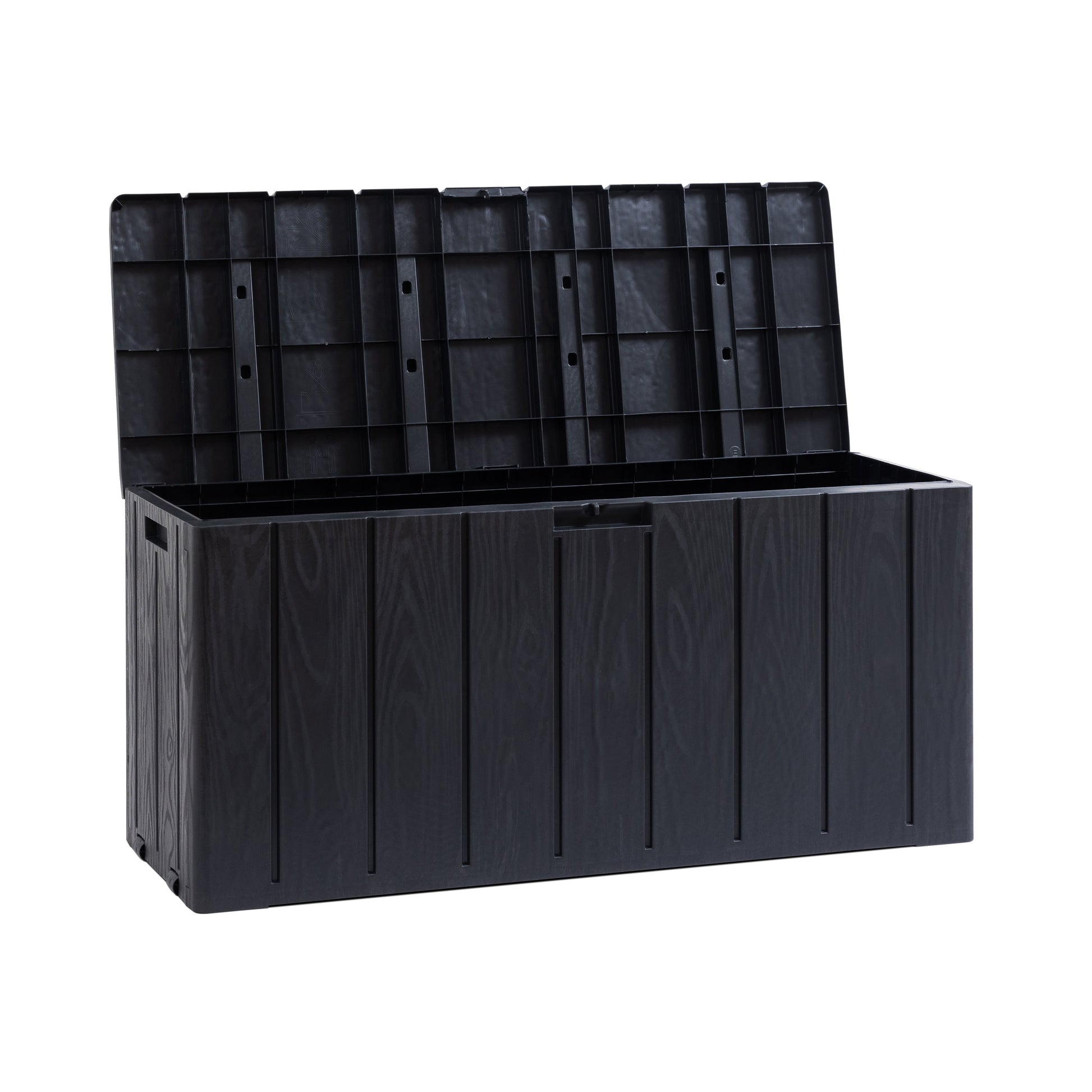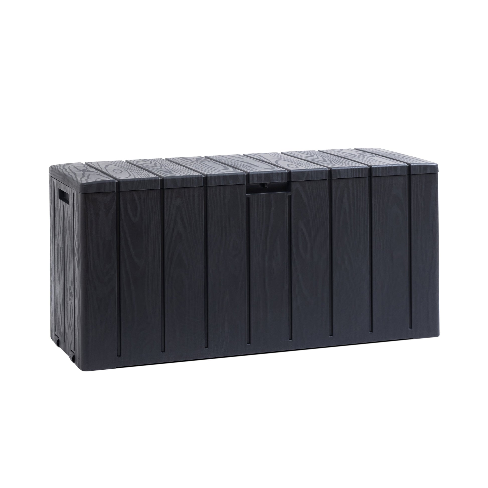 Outdoor cushion box. Two seatings. Wood style decoration. Capacity 270 L. Lockable. No tools required. Dim. 117,5x45x56h.