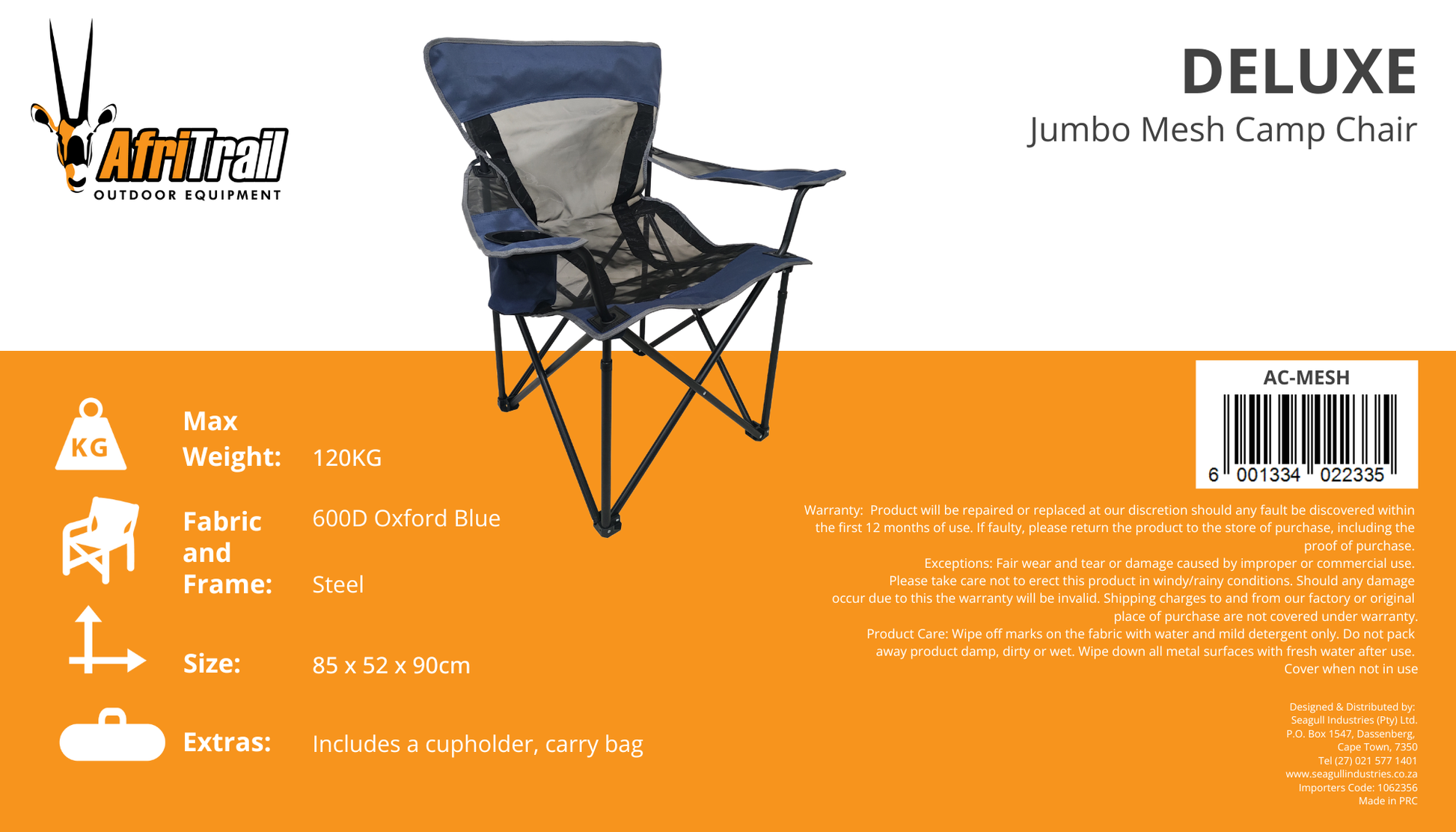 Experience superior comfort and support with the AfriTrail Deluxe Jumbo Mesh Camp Chair. Measuring 85x52x90 cm, this chair offers a spacious and comfortable seating area, ideal for outdoor relaxation. The robust 18mm steel tube frame ensures stability and durability, supporting up to 120 kg. Constructed from high-quality 600D Oxford fabric, this chair combines durability with comfort. The stylish blue and grey color scheme adds a modern touch to your outdoor adventures. For added convenience, it includes a cupholder on the armrest, so your favorite beverage is always within reach. Whether you’re camping, picnicking, or simply enjoying a backyard gathering, the AfriTrail Deluxe Jumbo Mesh Camp Chair provides the perfect blend of comfort and functionality.