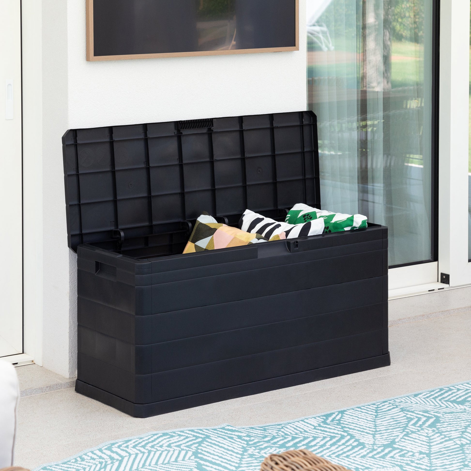 Multifunctional cushion box. UV resistant, no seating option. Capacity 280 L. Lockable. No tools required. Dim. cm. 117x45x56h.