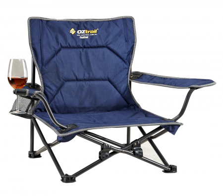 Lightweight, compact & comfy with drink & wine glass holders Strong high-tensile steel frame Rugged polyester fabric Padded seat and back rest Front strengthening hubs at cross points Wide arms Large drink holder and wine glass holder Comes in a carry bag