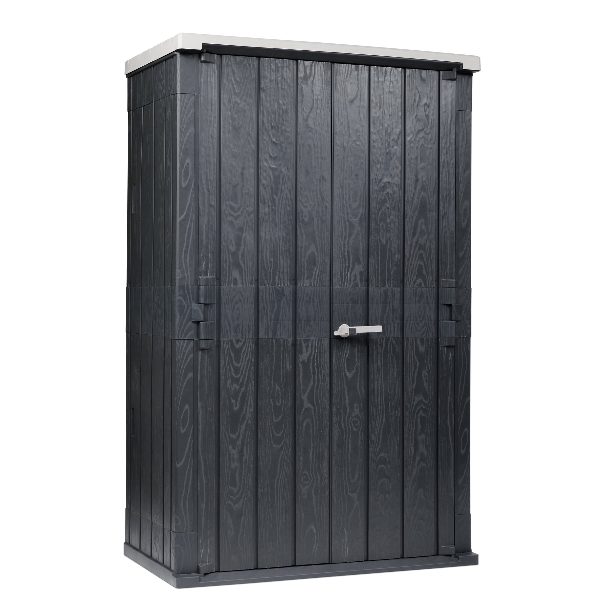 High shed with two overlapping wood style doors. Lockable handle. Slot at the bottom for water discharge. Sloped threshold. Can be fixed on the floor. UV resistant. Volume 1.670 L. Assembly tools required. Dim. cm. 130x75,6x206,2h.