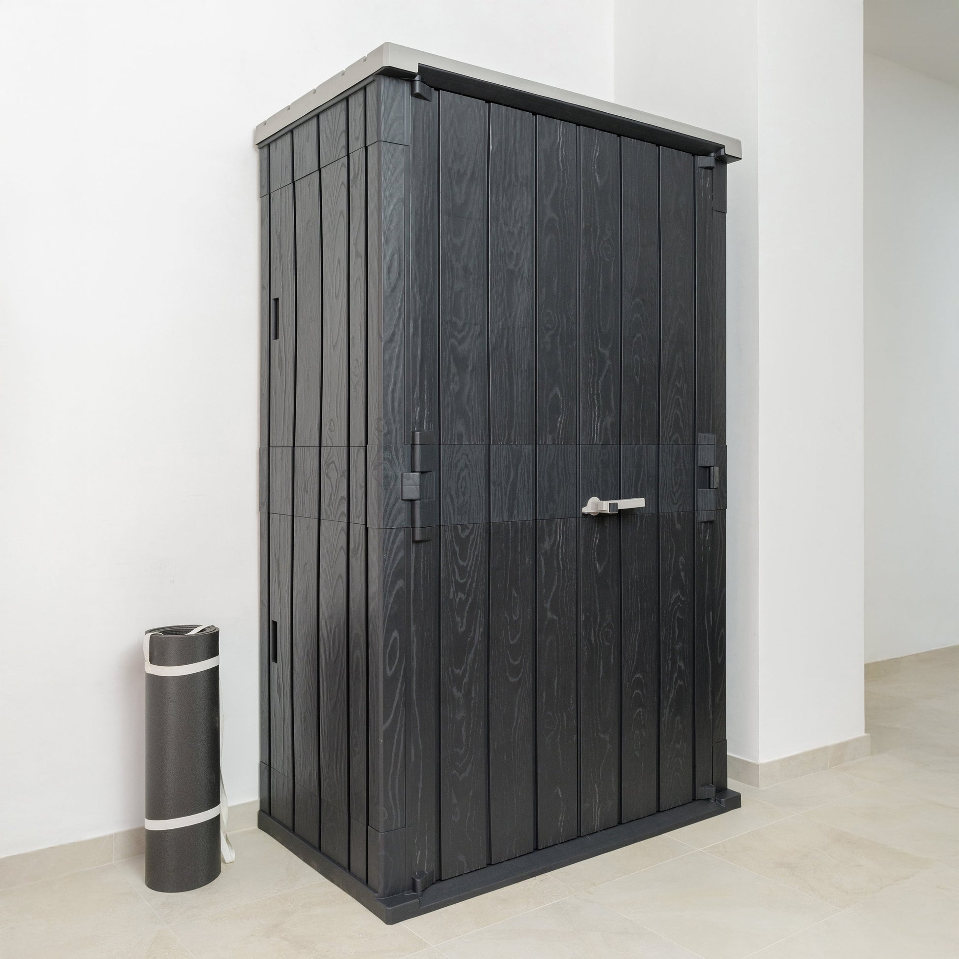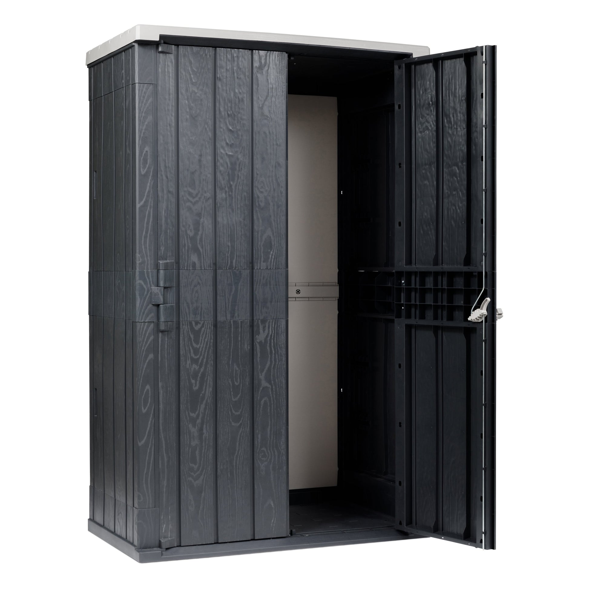 The High Stora Way garden tool chest is a practical and effective solution for storing large garden tools and equipment. The attractive wood-effect panels in contrasting grey and anthracite ensure this chest has a home in any garden. Usable internal dimensions 113.4x63.4x196; external dimensions 130 x 75.6 x 206.2h cm). The handle allows for easy opening of the doors and the padlock hole offers the possibility of closing everything in complete safety (padlock not supplied). Made from recycled and recyclable plastic, it is resistant to UV rays and bad weather, requires no maintenance and can be cleaned with a cloth, water and neutral soap. Recommended for fixing to the ground or to the wall, on a smooth and level surface.