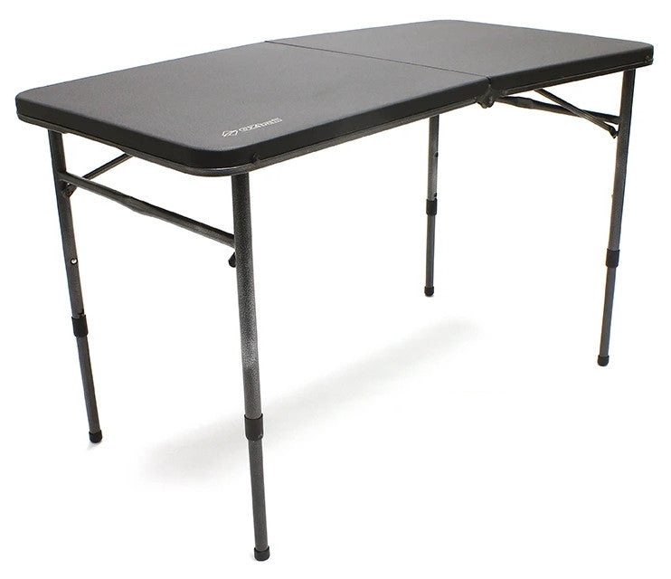 The Oztrail Ironside Fold In Half Table - 1.2m is a rugged yet stylish camping table that's just the right size for small camping parties, additional table or prep space, or even a coffee table for those well-equipped camp-sites. It won't take up too much space in your car, trailer or caravan either thanks to its folding design. The table is height adjustable and has three different height settings, so you'll always find it the perfect fit.