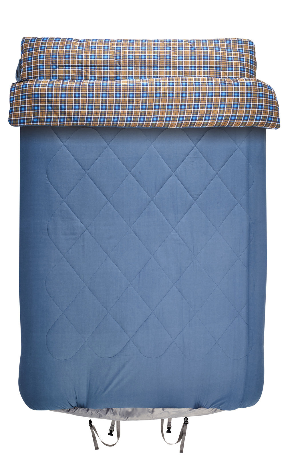 The complete camp bedding in a bag. Tailored to fit snugly onto your queen camping mattress. With soft touch flannel poly/cotton lining and all cotton outer the non-allergenic polyester filling is quilted into position to ensure even distribution and warmth.