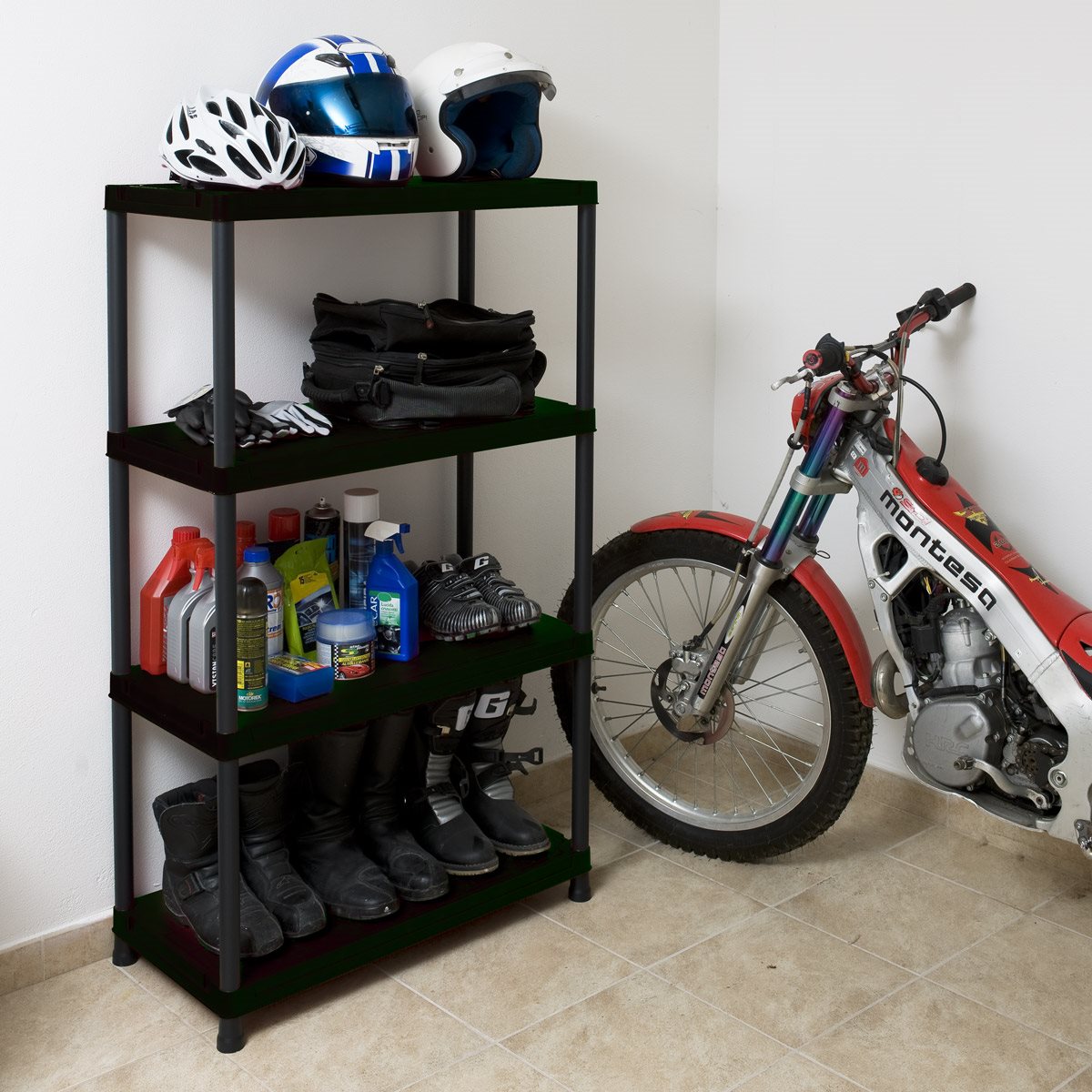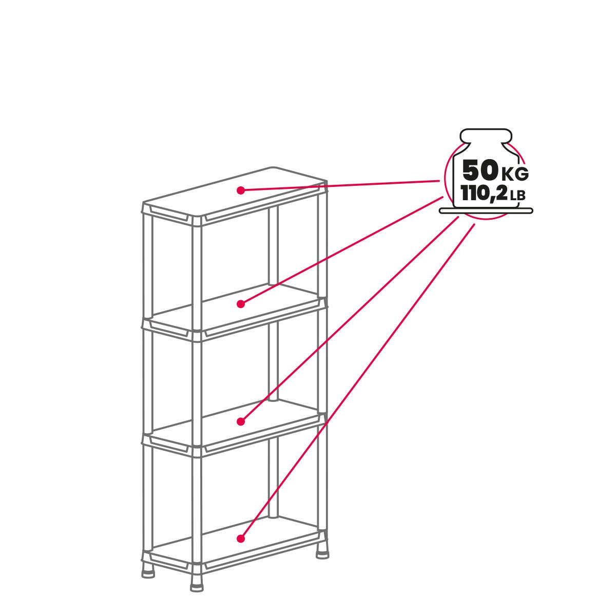 Four-shelf unit. Equipped with wall mount kit. Maximum total weight per shelf 25Kg max total 125 kg. Certificate TÜV-GS. Assembly